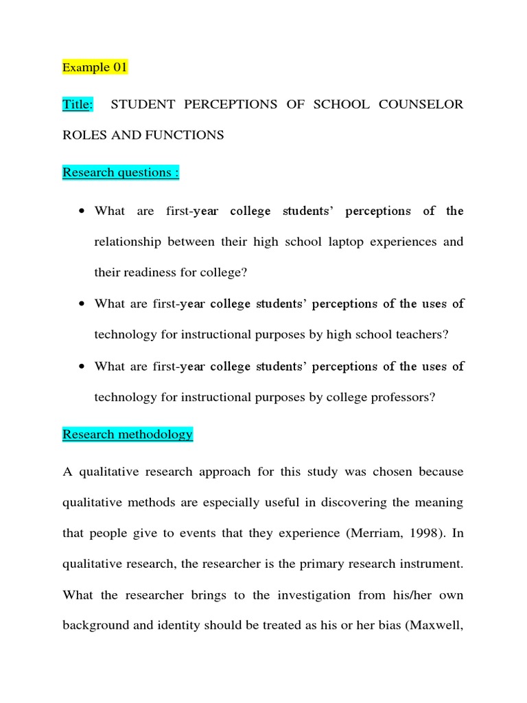 In short, chapter 1 describes why the research question is being asked and chapter 3 describes how the research question is answered. If your desire is to perform a qualitative study, it will probably be a lot easier to develop your research question if you first become familiar with some of qualitative research's basic … Definition of key terms keep this brief, if extensive a glossary is required, which would belong in the appendices In this study, the researcher used qualitative research method. All three authors are trained anthropologists who have been working in health and development for many years.